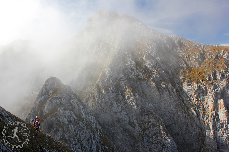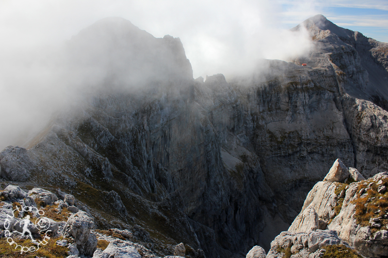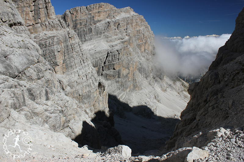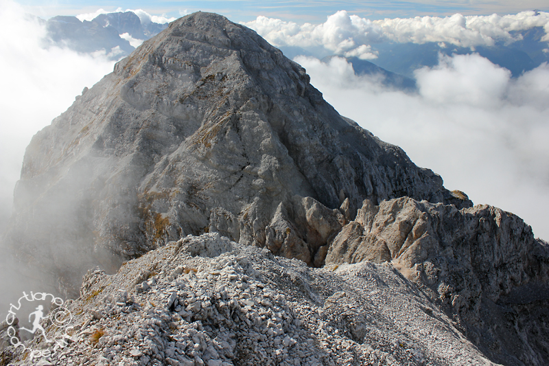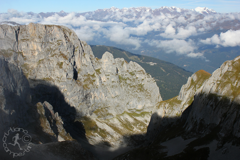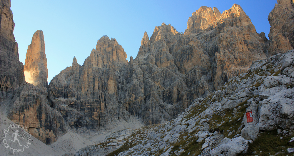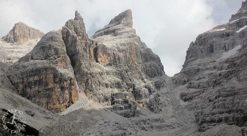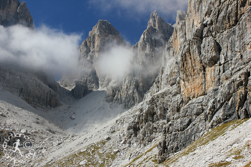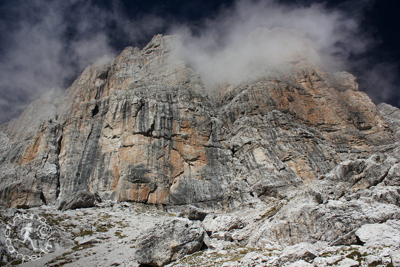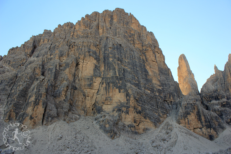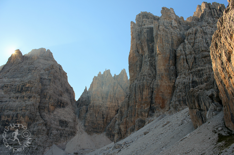 Ai nostri piedi s’alzano potenti speroni, in basso scuri di pini, in alto nudi e bianchi; la loro forma è semplice e severa, ma ogni mutamento di luce mette allo scoperto nuovi dettagli della cesellatura che il tempo ha inciso profondamente sui loro fianchi.